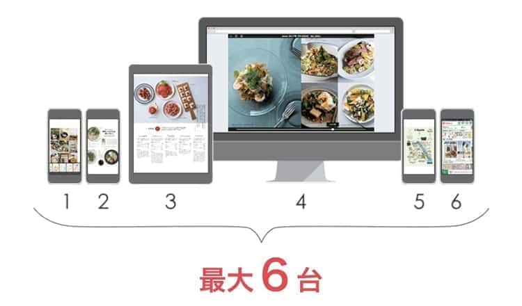 スマホ・タブレット合わせて5台+パソコン1台の合計6台まで共有可能。